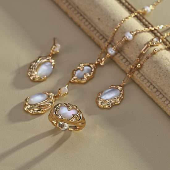 Inspired by a vintage aesthetic, this necklace blends a molten-lava fluid design with the elegance of natural mother-of-pearl. The delicate white nacre shimmers beautifully, and its naturally irregular textures create a luminous, eye-catching glow.